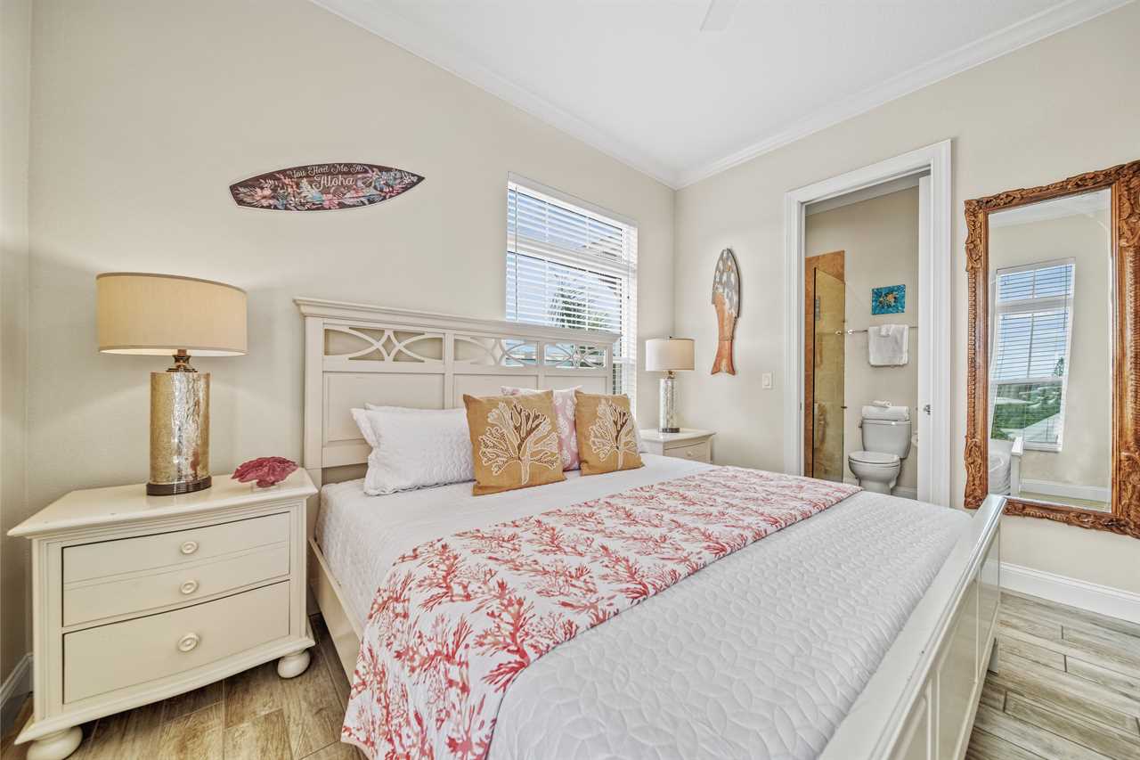 • Bedroom 1: King Bed + Twin Chair Sleeper, Ensuite Bath, TV