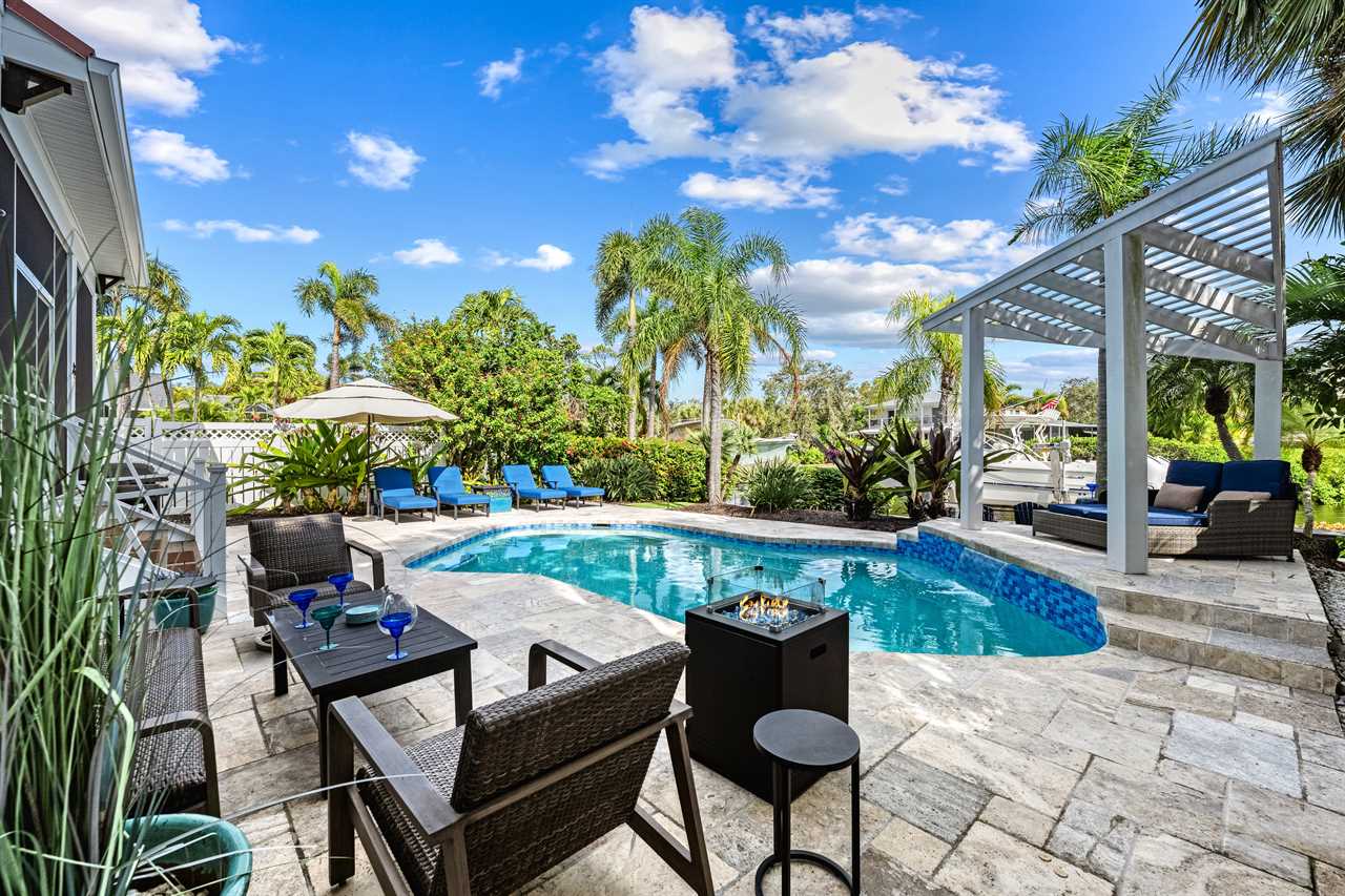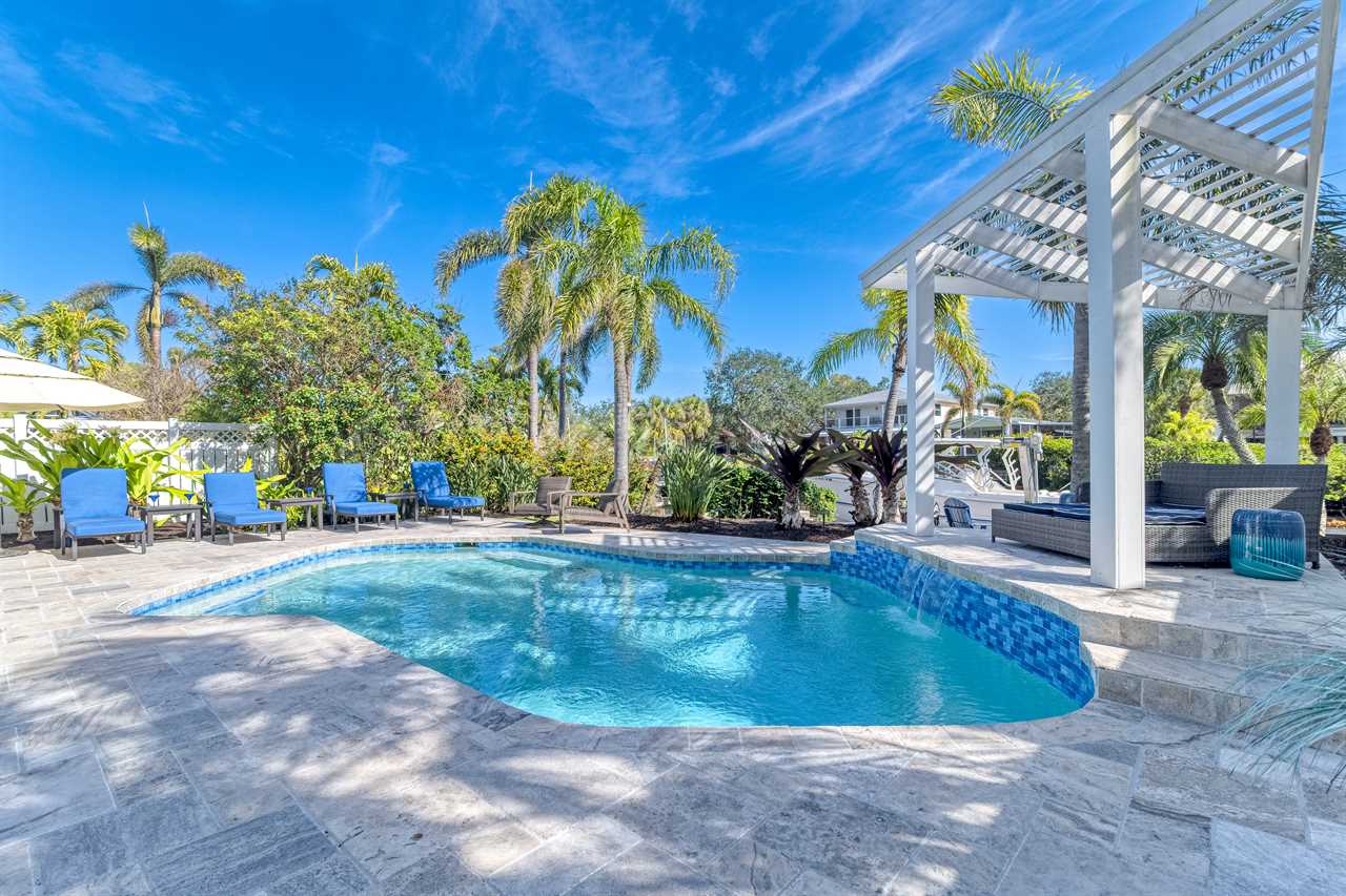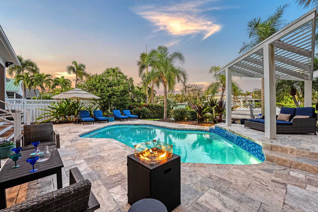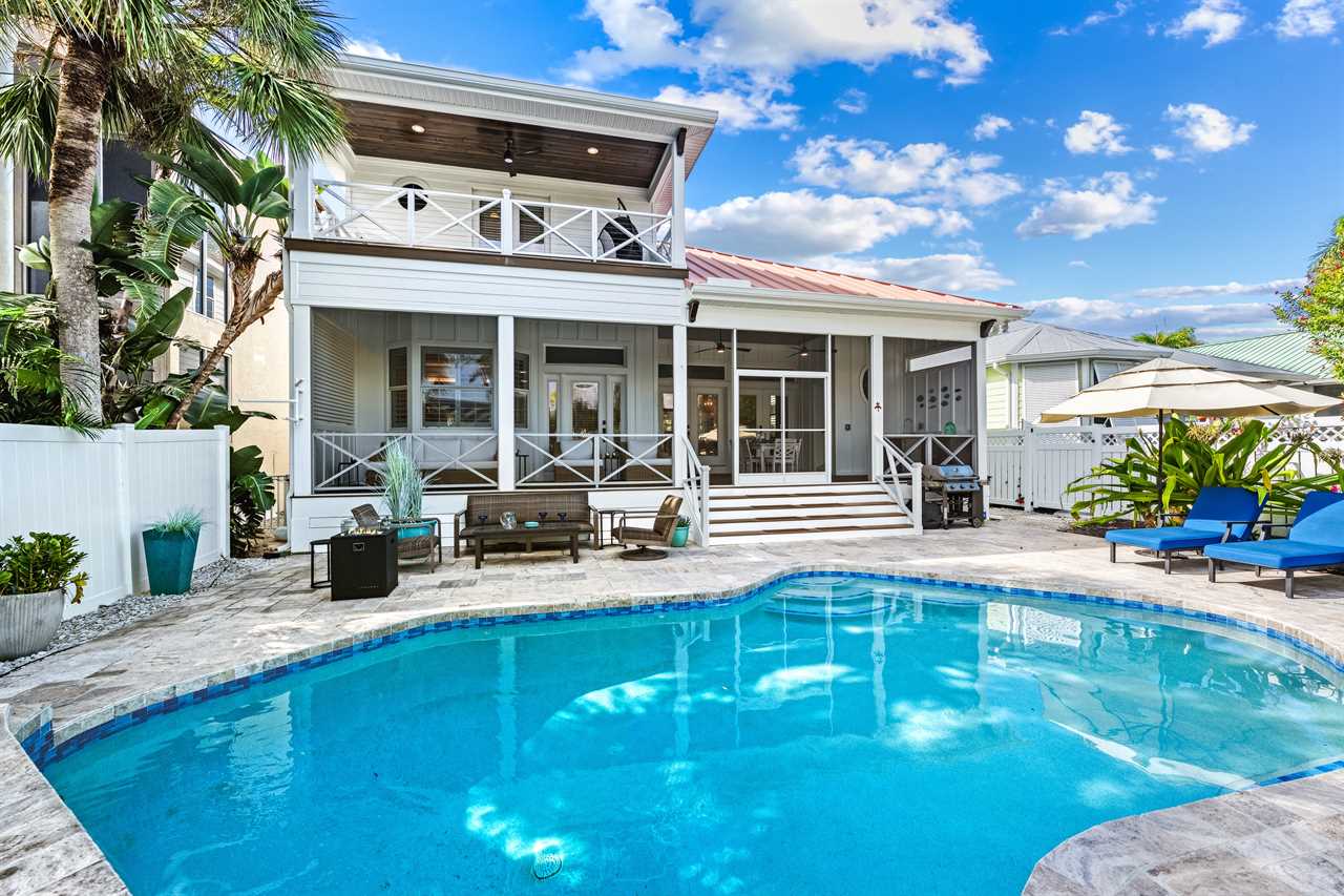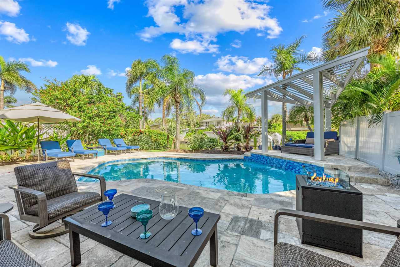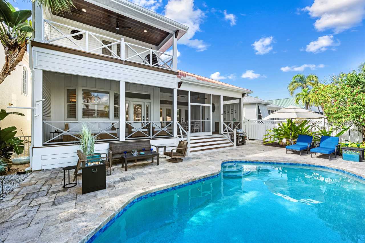 Begin your day with coffee on the main floor balcony, the canal glistening below and palms swaying in the breeze. Head inside to the gourmet kitchen to whip up breakfast, or grab your beach gear—just a 7-minute stroll (0.3 miles) and you're on Siesta Key Beach's iconic powder-white sand. Spend the afternoon lounging by the heated pool or enjoying drinks at the outdoor wet bar with a mini fridge. As the sun sets, gather around the table-top fire pit or dine al fresco in the screened-in porch. Whether you're sharing laughs at the indoor bar or winding down in your plush king suite, Isla Amor wraps every moment in warmth and comfort.