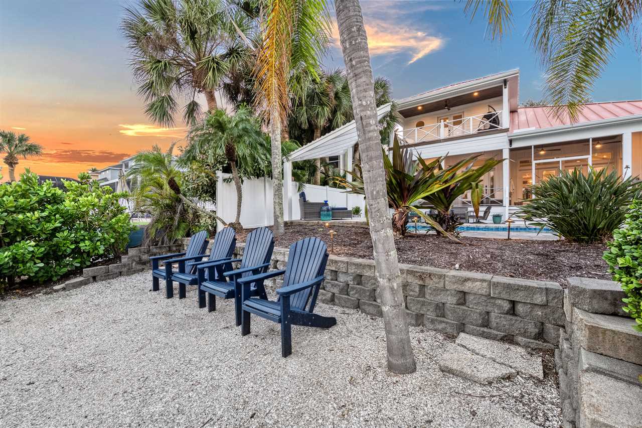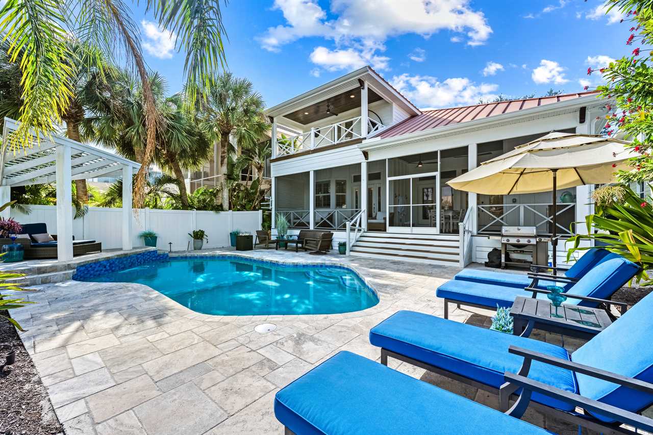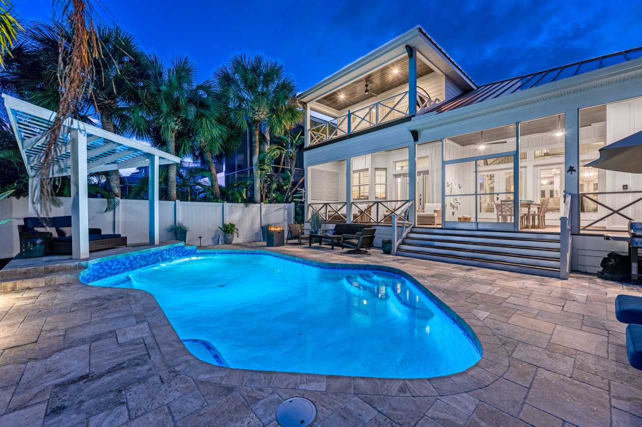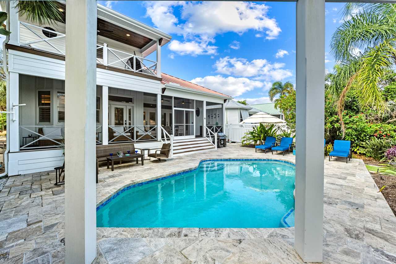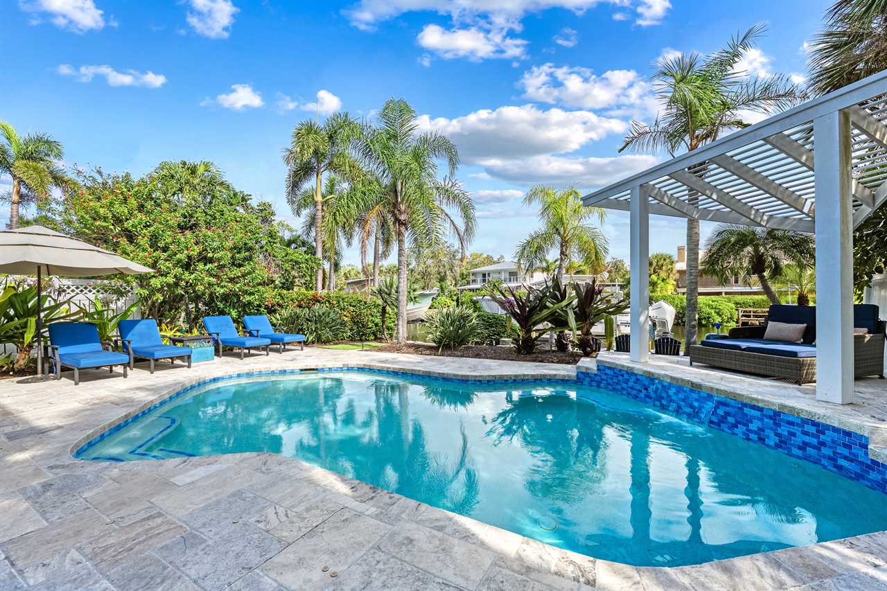 Begin your day with coffee on the main floor balcony, the canal glistening below and palms swaying in the breeze. Head inside to the gourmet kitchen to whip up breakfast, or grab your beach gear—just a 7-minute stroll (0.3 miles) and you're on Siesta Key Beach's iconic powder-white sand. Spend the afternoon lounging by the heated pool or enjoying drinks at the outdoor wet bar with a mini fridge. As the sun sets, gather around the table-top fire pit or dine al fresco in the screened-in porch. Whether you're sharing laughs at the indoor bar or winding down in your plush king suite, Isla Amor wraps every moment in warmth and comfort.