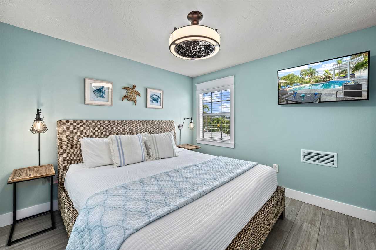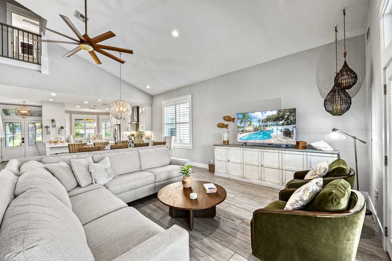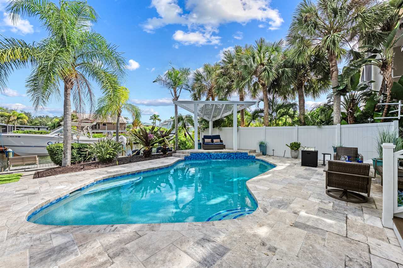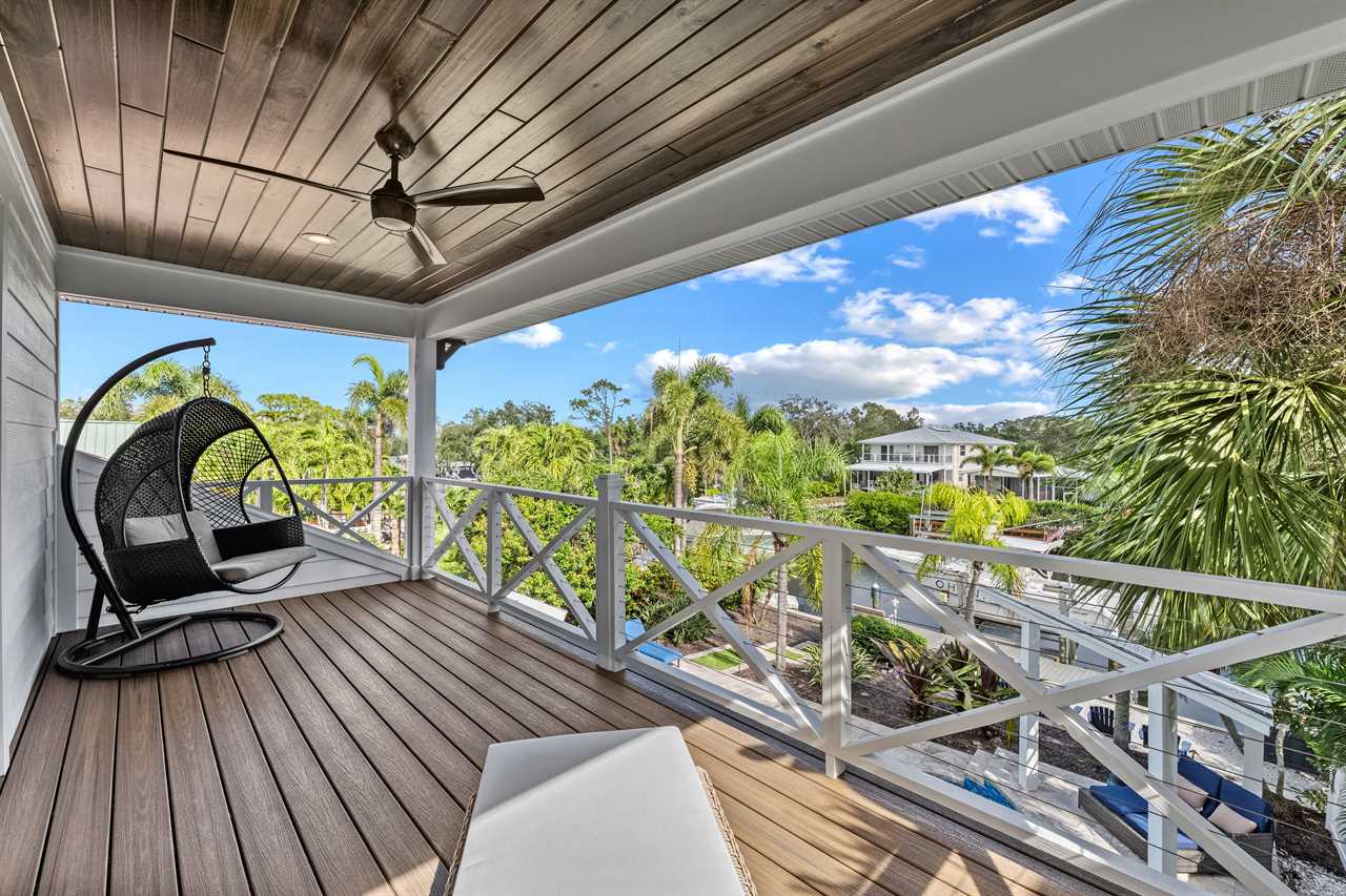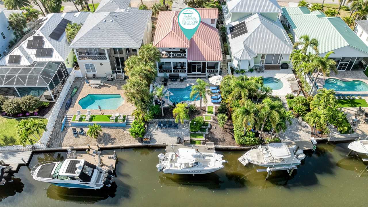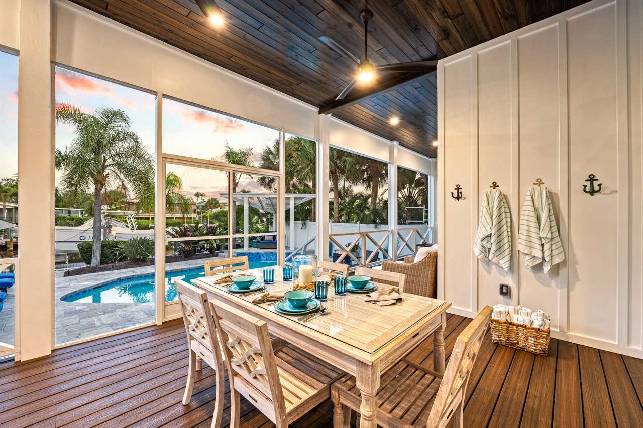 Begin your day with coffee on the main floor balcony, the canal glistening below and palms swaying in the breeze. Head inside to the gourmet kitchen to whip up breakfast, or grab your beach gear—just a 7-minute stroll (0.3 miles) and you're on Siesta Key Beach's iconic powder-white sand. Spend the afternoon lounging by the heated pool or enjoying drinks at the outdoor wet bar with a mini fridge. As the sun sets, gather around the table-top fire pit or dine al fresco in the screened-in porch. Whether you're sharing laughs at the indoor bar or winding down in your plush king suite, Isla Amor wraps every moment in warmth and comfort.
