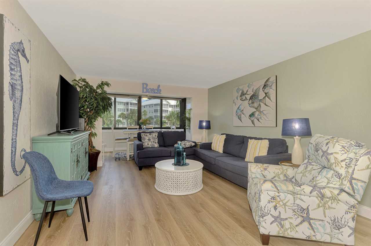 The living room is open and bright, extending onto the glass covered lanai. On the lanai you may sit at the bistro table and view the private harbor, watching the boats and wildlife pass.