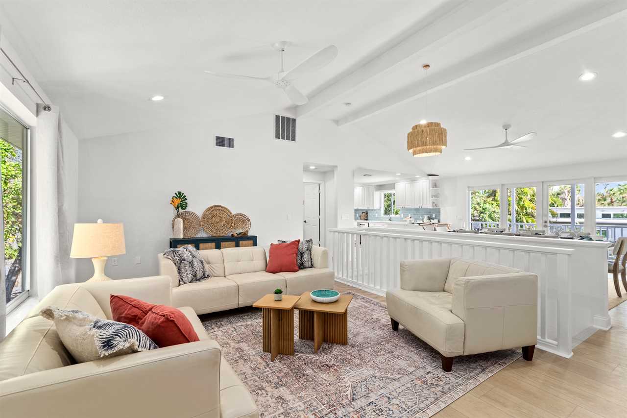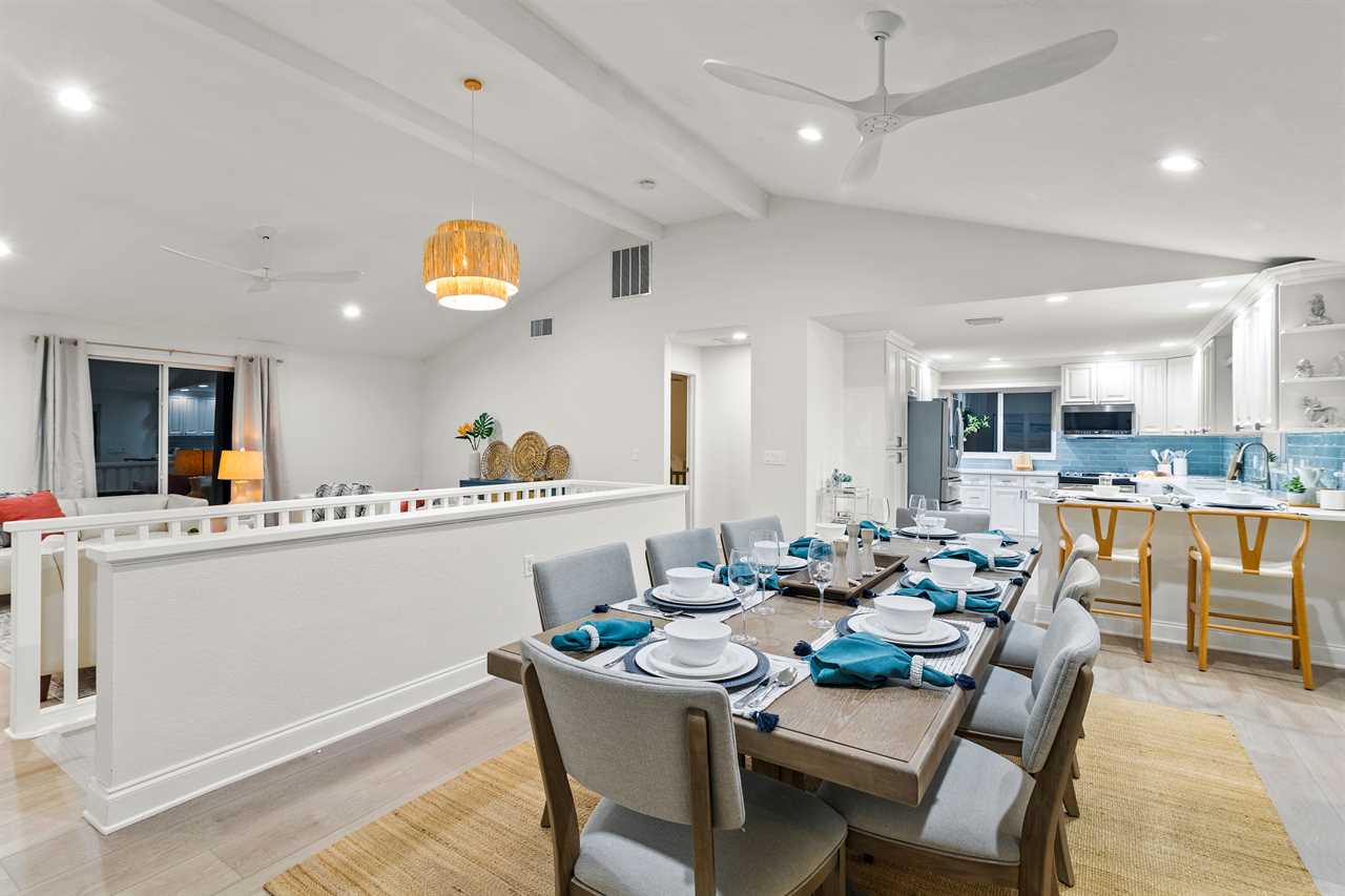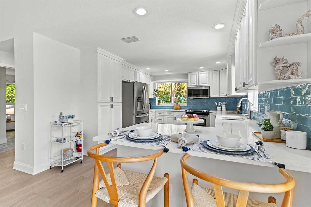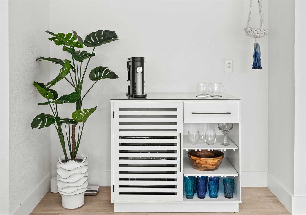 At the heart of the home is a chef-ready kitchen with modern appliances and everything you need to cook, dine, and entertain. Start your day with coffee from either the classic drip machine or Keurig, then enjoy a breezy breakfast outdoors as the palms rustle overhead.