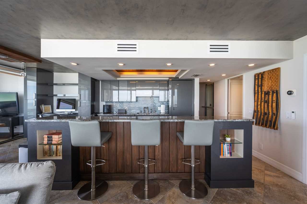 • Granite countertops and bar seating for three