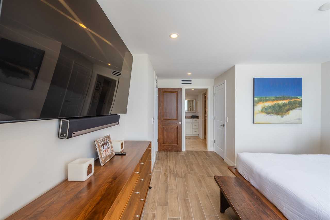 The primary bedroom features a plush king bed, large TV, and floor-to-ceiling glass that frames the coastline from sunrise to sunset. The bathroom includes a walk-in shower and elegant finishes throughout.